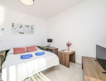 Referenz-Nr.Imperial Park, 2-Zimmer-Wohnung 47 m2 im 1. Stock. Hell, komfortabel und schön eingerichtet: Wohn-/Esszimmer mit 1 Diwanbett, Digital-TV, Klimaanlage und Warmluftheizung. Ausgang zur Terrasse. 1 Zimmer mit 1 franz. Bett (1 x 160 cm, Länge 200 cm), Klimaanlage und Warmluftheizung. Offene Küche (3 Glaskeramikplatten, Toaster, Wasserkocher, Mikrowelle, elektrische Kaffeemaschine). Bad/WC. Terrasse. Terrassenmöbel. Panoramasicht auf das Meer, die Ortschaft und das Städtchen. Zur Verfügung: Waschmaschine, Bügeleisen, Haartrockner. Internet (Wireless LAN, gratis). Parkplatz Nr. 121. Bitte beachten: Nichtraucher-Haus. VT-510712-A