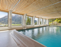 Davos: Appartementhaus Guardaval (Utoring). Im Ort, zentrale, ruhige, sonnige Lage am Hang, 1 km vom See, 300 m vom Skigebiet. Zur Mitbenutzung: Hallenbad. Im Hause: Empfang, Aufenthaltsraum mit TV, Wireless LAN, Sauna (extra). Spielzimmer, Fahrstuhl, Skiraum, Zentralheizung, Waschmaschine (zur Mitbenutzung). Brötchenservice und Getränkeservice. Schmale Zufahrt bis zum Haus. Parkplatz (überdacht, beschränkte Anzahl, extra), Gemeinschaftsgarage (extra). Einkaufsgeschäft 300 m, Restaurant 300 m, Bushaltestelle, Bahnstation Davos Dorf 400 m, Hallenbad 1 km, Badesee 1 km. Bergeisenbahn, Skisportanlagen, Skipisten, Skischule, Schlittelbahn 1.5 km, Langlaufloipe, Eisfeld 300 m. Bekannte Skigebiete sind gut erreichbar: Parsenn 300 m, Jakobshorn 1.5 km. Das Appartementhaus befindet sich oberhalb der Talstation der Parsennbahn und verfügt über eine herrliche Aussicht. Parkplatz + Garage (Reservierung bei Ankunft).